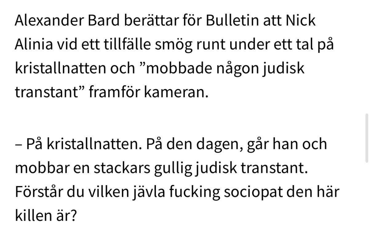 Idag publicerades en artikel i Bulletin där både Alexander Bard och Chang Frick släpper ut sina extremt starka känslor kring mig ytterligare. Chang Frick fortsätter att kalla mig för okvädningsord och Alexander Bard tar det hela ytterligare ett steg, genom att på ett helt absurt sätt totalt fabricera en historia om att jag ska ha “mobbat en stackars gullig judisk transtant”.