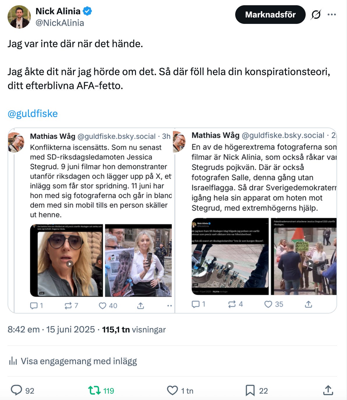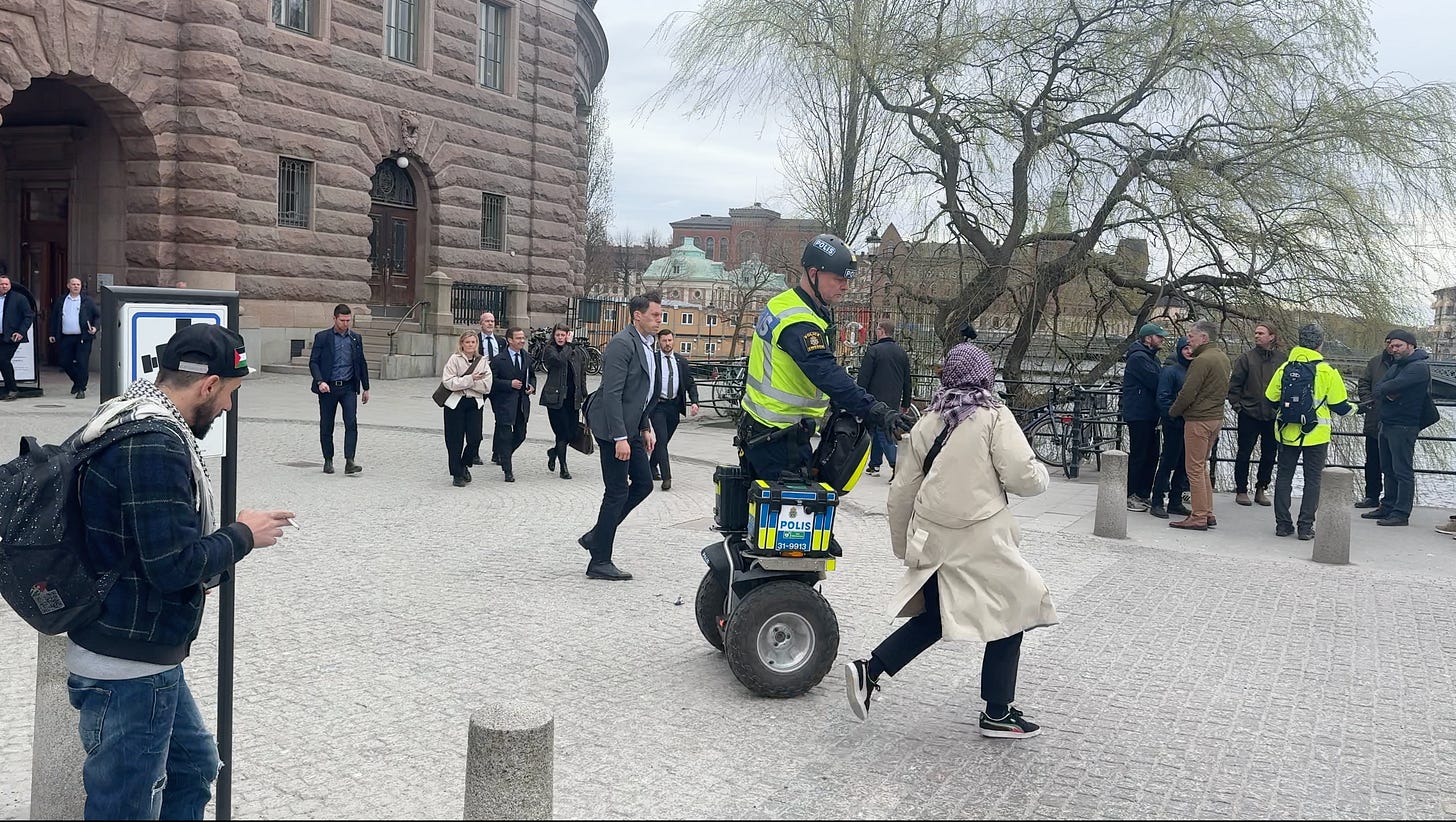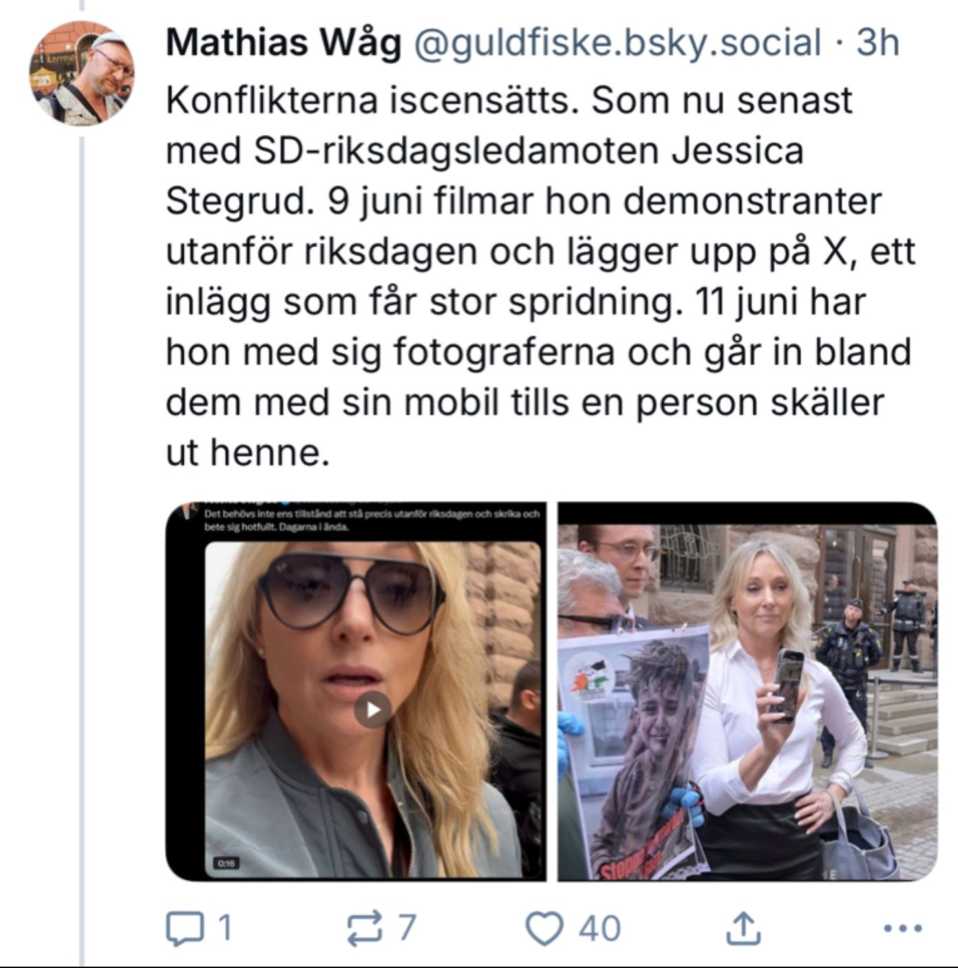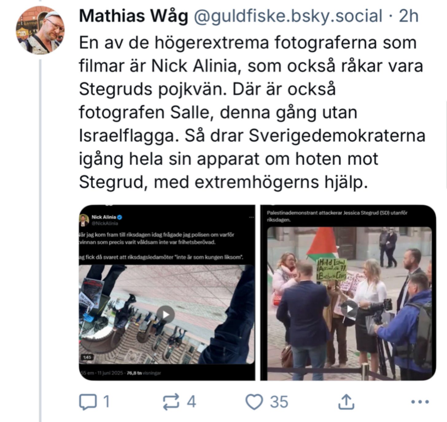 Attacken utanför riksdagen i somras följdes av att Palestina-rörelsen och extremvänstern i form av bland andra ledaren för våldsgruppen AFA, Mathias Våg och HBTQ-islamisten Bilan Osman, började påstå att Sverigedemokraterna och Jessica Stegrud tillsammans med “alternativmedia” - som jag och Svenska Epoch Times - i förväg planerat och iscensatt denna händelse. Detta med hänvisning till att Epoch Times fanns på platsen och att jag kommit dit efter att jag fått höra vad som hänt (när situationen redan var över).