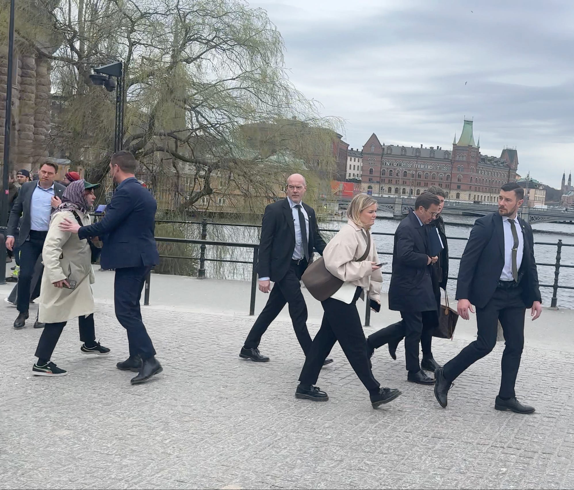 Den militanta Palestina-aktivisten och vänsterextremisten Sara Skogsmark har även försökt attackera statsministern Ulf Kristersson när denne gick från riksdagsbyggnaden till Rosenbad. Vid detta tillfälle behövde polis och statsministerns personskydd ingripa fysiskt för att skydda statsministern från Sara Skogsmark. En ganska bisarr scen. Även vid detta tillfälle var Skogsmark utanför riksdagen med andra brottsdömda Palestina-extremister.