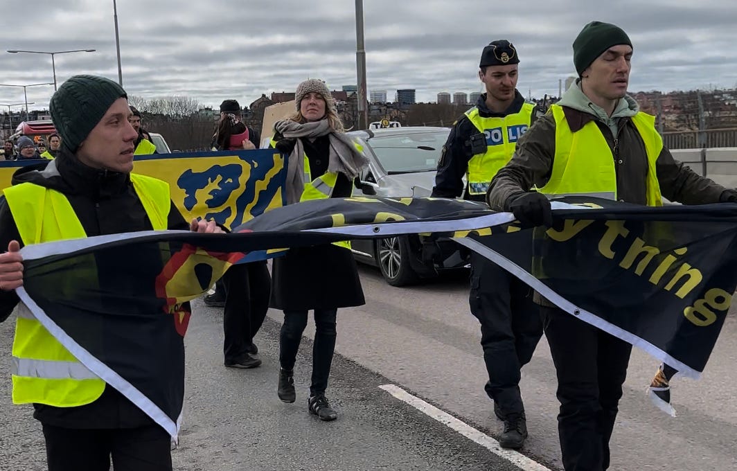 Det handlar om den uppmärksammade aktionen då demonstranter medvetet satte sig över samtliga körfält på E4:an vid Solna, med banderoller och västar. Flera hade limmat fast sig på vägbanan. Trafiken stoppades helt i 20 minuter och var delvis blockerad i ytterligare 30. En ambulans på utryckning försenades med tio minuter – ändå frias aktivisterna.