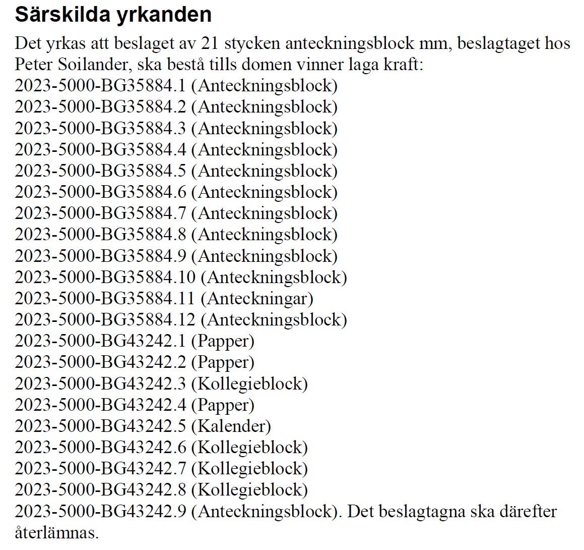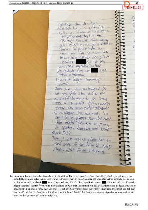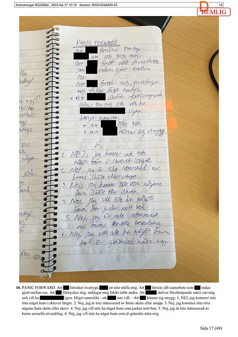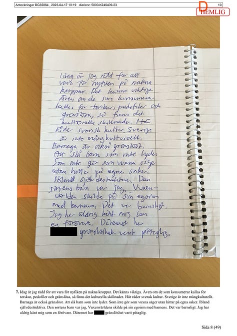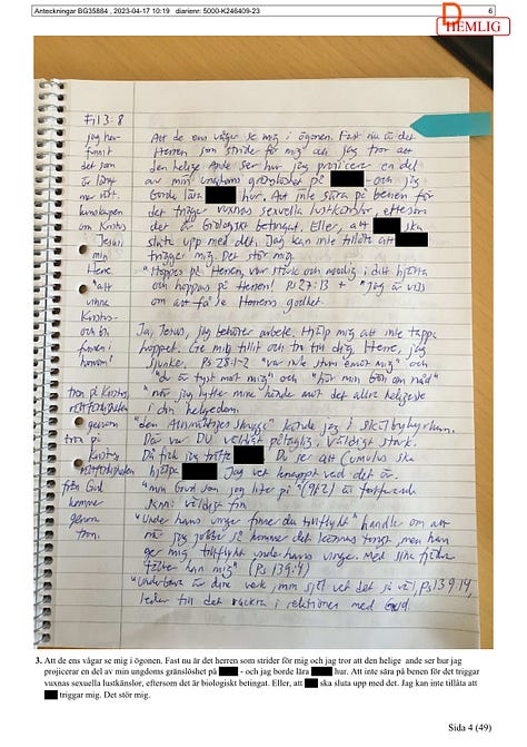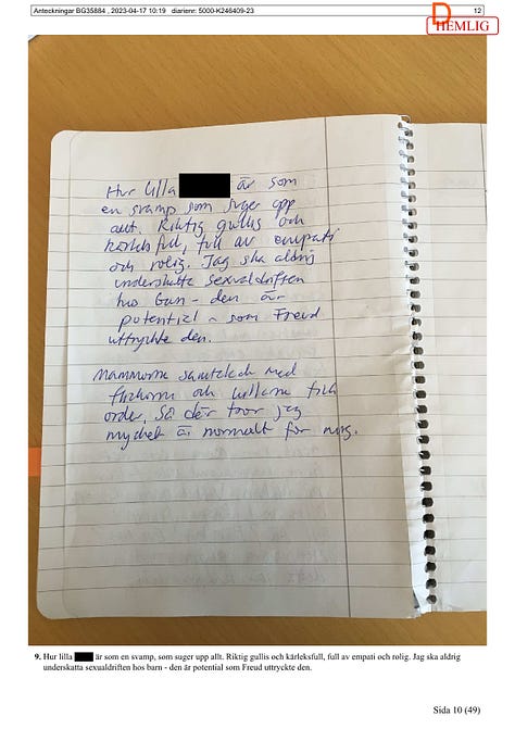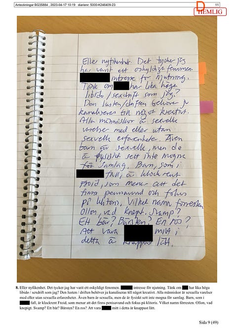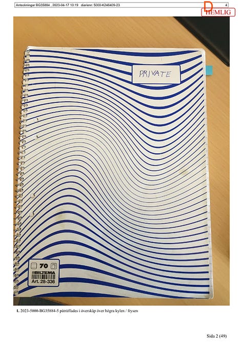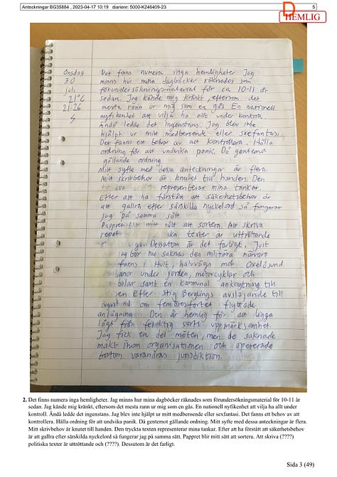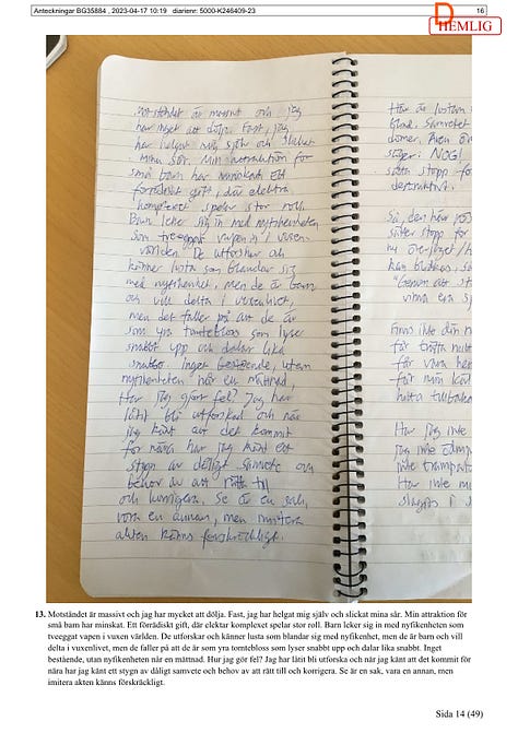De beslagtagna anteckningsblocken, 21 till antalet, blev snabbt centrala i utredningen. De innehöll inte beskrivningar av brott, men de innehöll det som polisen brukar kalla “självbildsmaterial”: resonemang om hur han uppfattar sig själv, sin roll, sin rättfärdighet och sin relation till omvärlden.