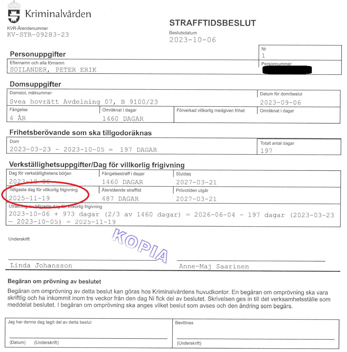 Efter hovrättsdomen fattade Kriminalvården ett strafftidsbeslut. Peter Soilander skulle avtjäna två tredjedelar av straffet i anstalt, vilket motsvarar drygt två år och åtta månader.
