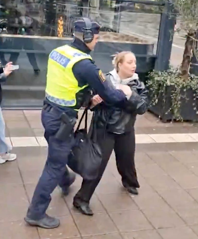 En video på sociala medier visar hur polis ingriper mot och för bort en en vänsterpartistisk tjänsteman, närmare bestämt en av Nooshi Dadgostars pressekretarare.