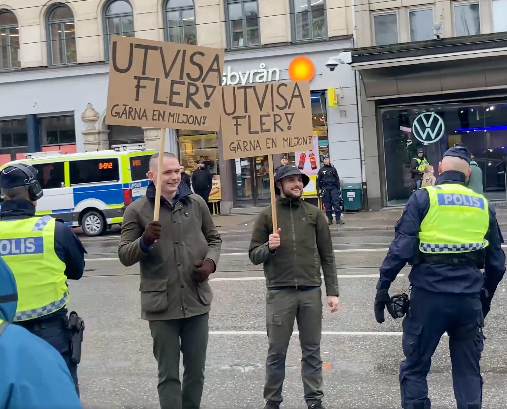 Händelsen inträffade vid en demonstration för ökad invandring på Norrmalmstorg i Stockholm, där de två motdemonstranterna Tyr och Torbjörn Ängslasjö hade dykt upp med varsin skylt som gick emot demonstrationens budskap. Den vänsterpartistiska tjänstemannen Hanna Brolund gick då till våldsamt angrepp mot motdemonstratnerna, och efter tumultet var en av skyltarna förstörd.