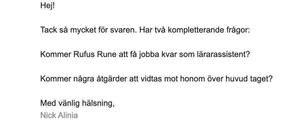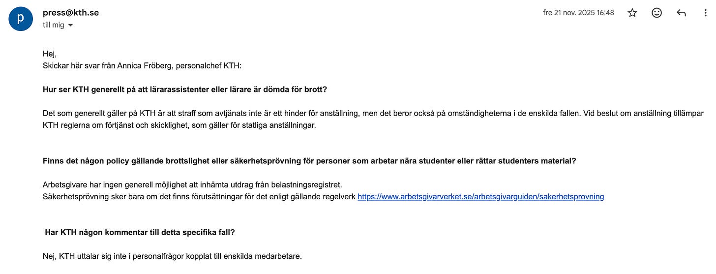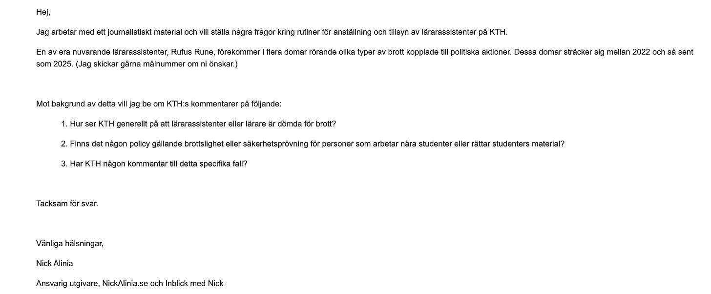 Jag kontaktade Kungliga Tekniska Högskolan för att få svar på mina frågor kring Rufus Rune och hans brottslighet. De svarade så här: