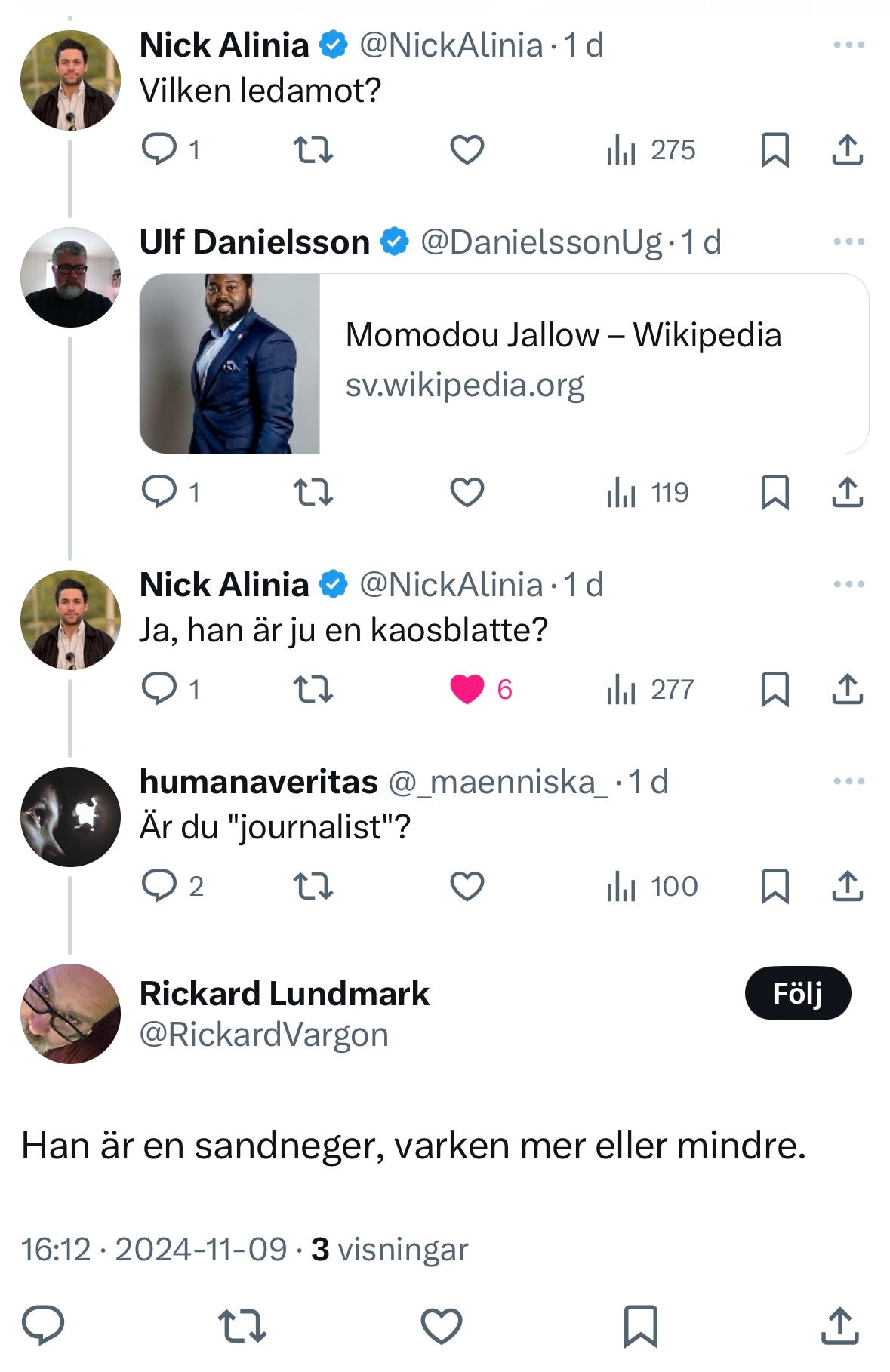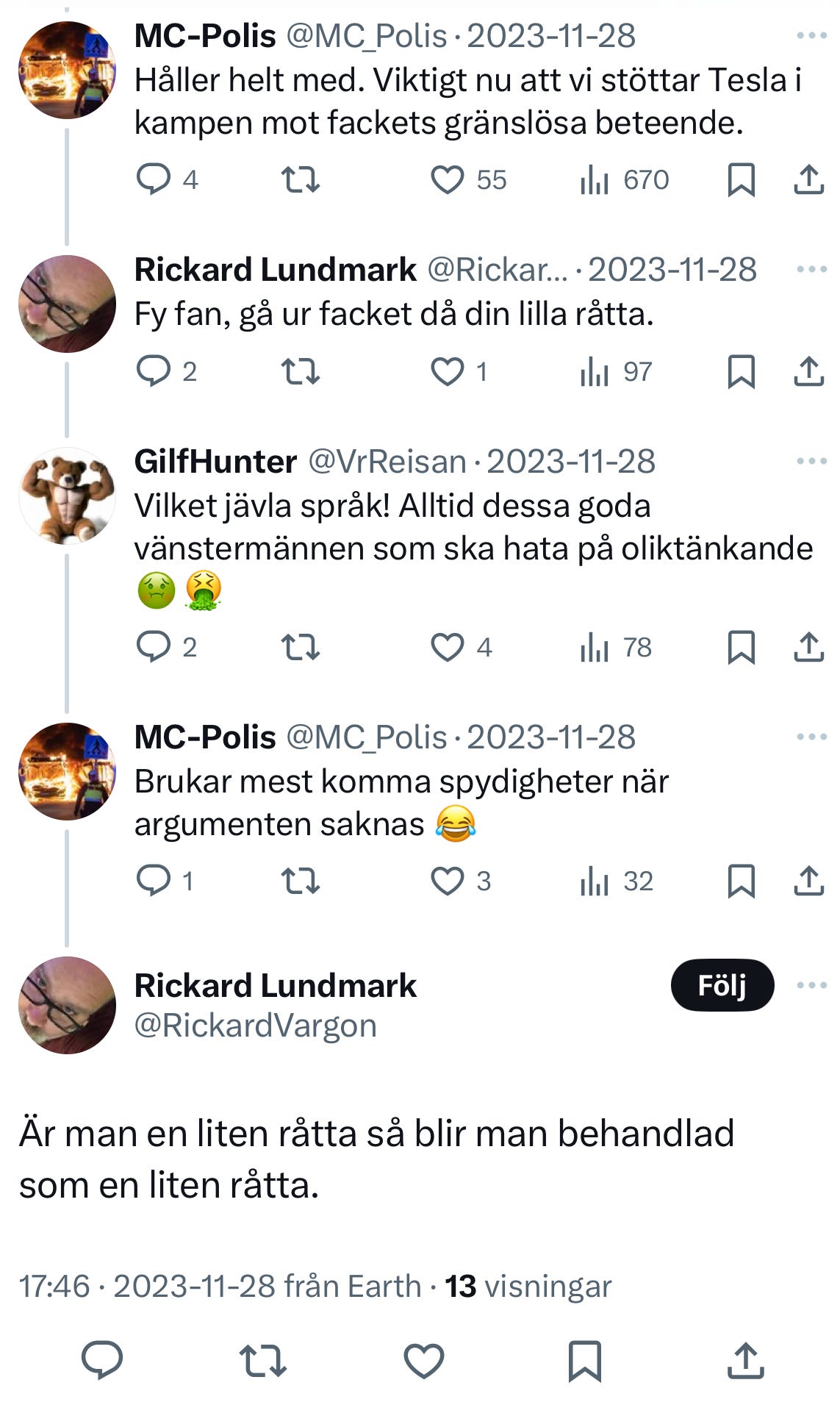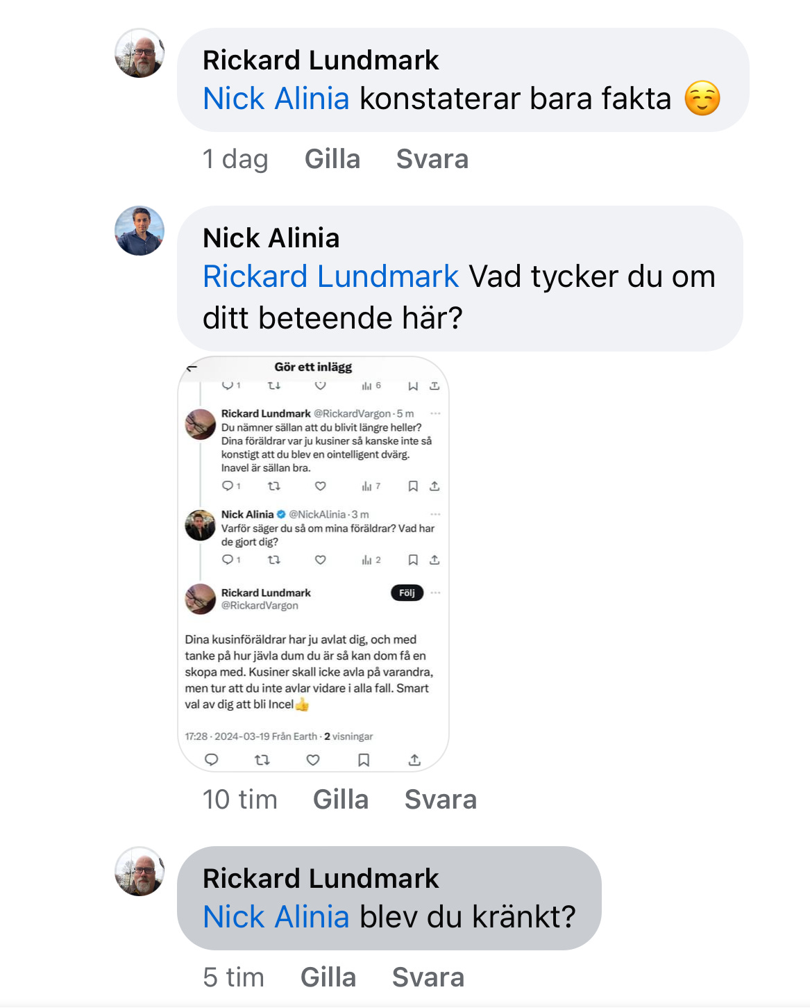 Rickard Lundmark beter sig värre än många anonyma trollkonton, men skriver alltså allt under eget namn och bild. Varför Rickard Lundmark verkar urspårad till denna grad, som om han inte har någonting att förlora, är oklart och går bara att spekulera om.