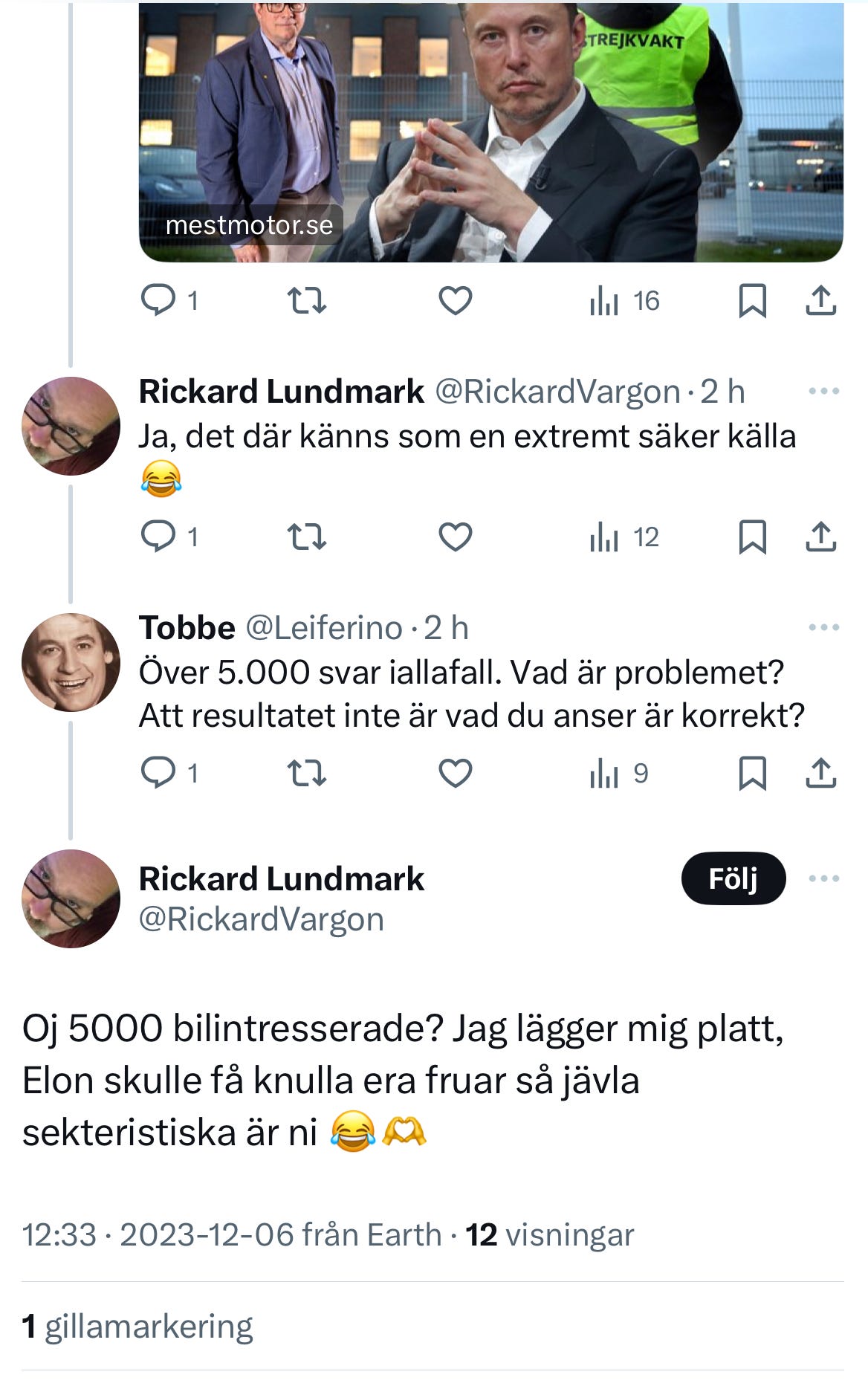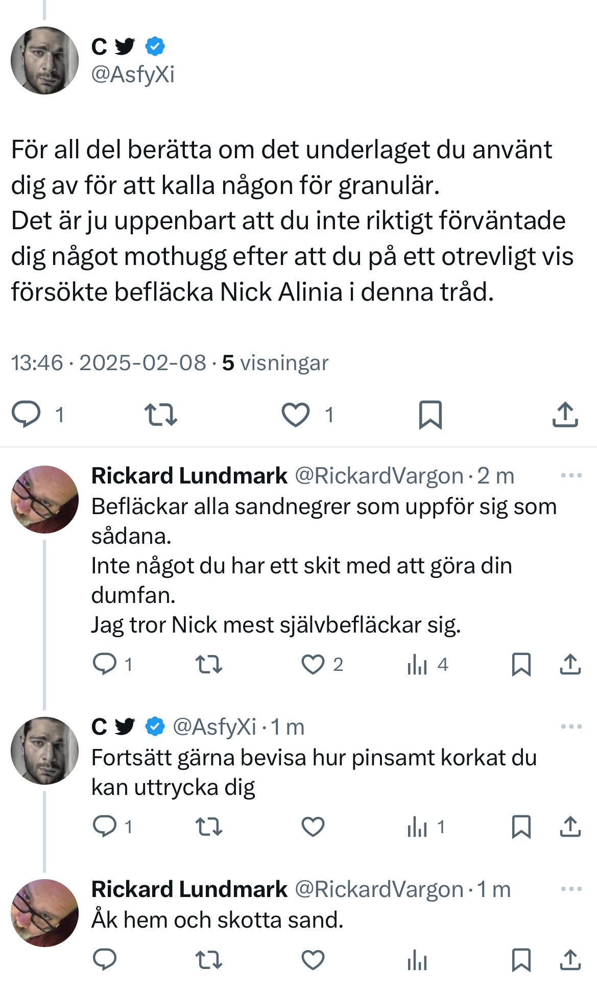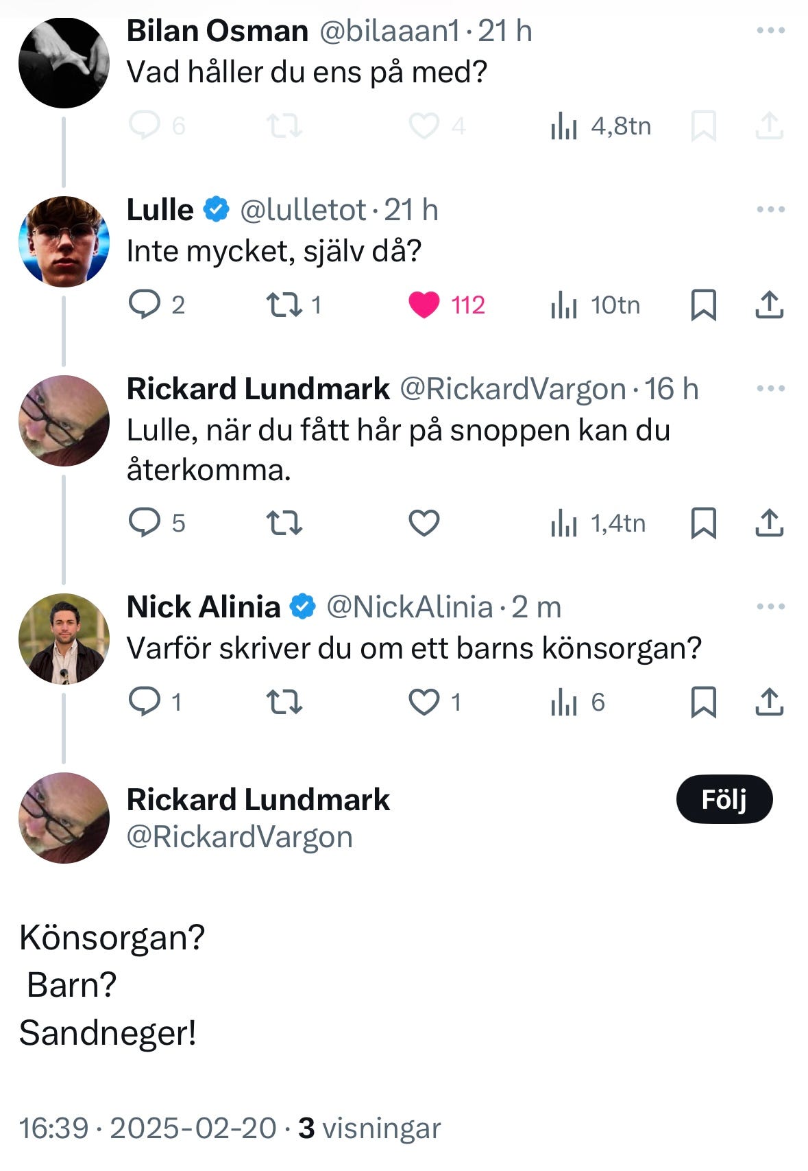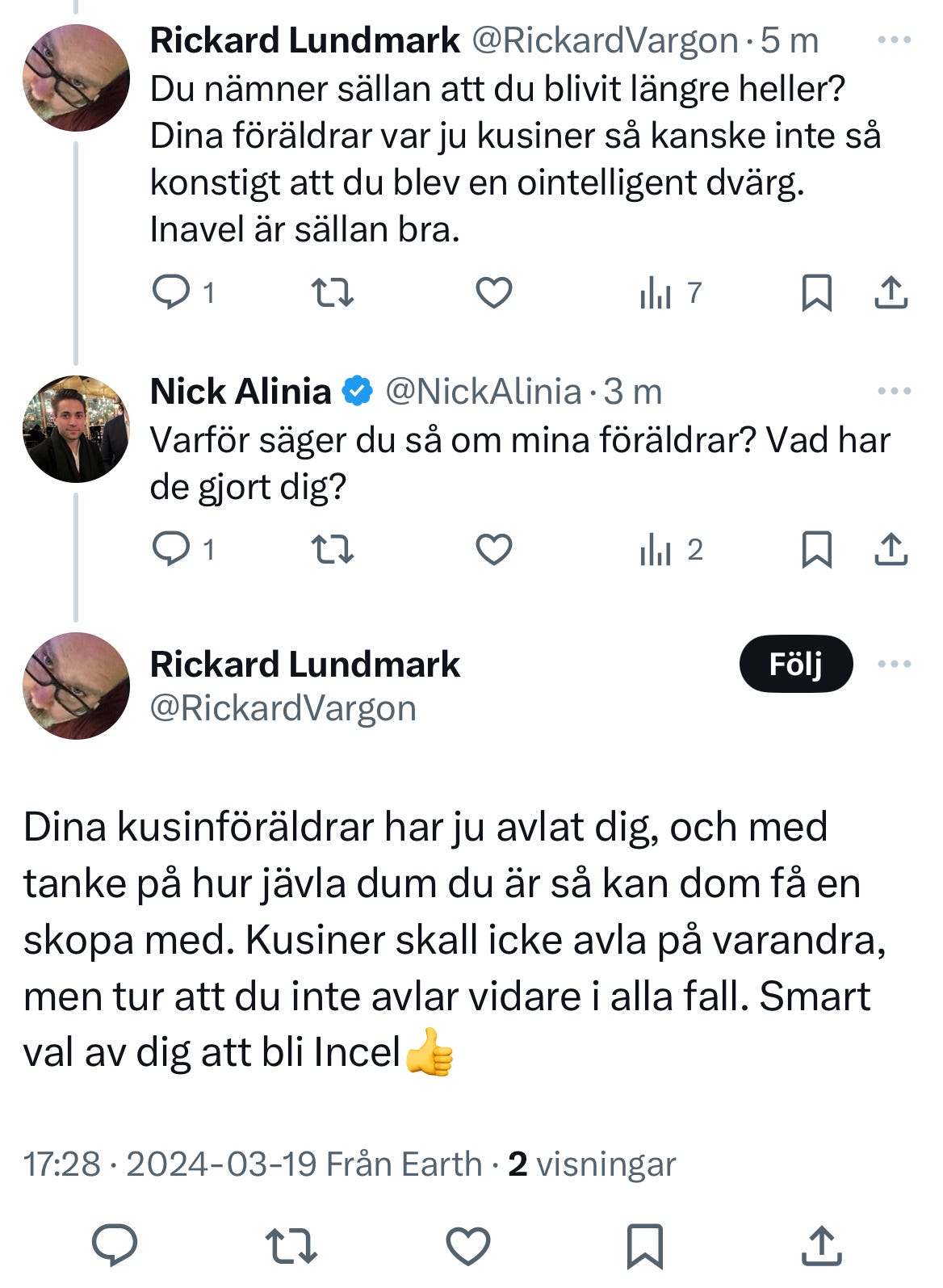 Rickard Lundmarks X-konto, kontot RickardVargon, har under flera års tid betett sig som de mest urspårade av anonyma trollkonton som förekommer på plattformen X (tidigare Twitter). Men han har gjort det under eget namn, och med bild på sig själv.