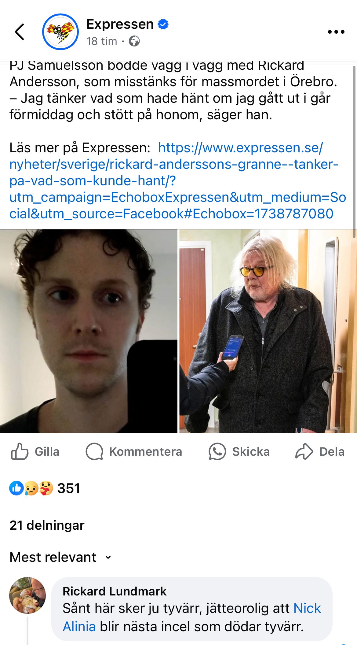 Här påstår Rickard Lundmark att han är orolig för att jag ska utföra ett massmord. Detta som en del i en rad av trakasserier som är polisanmälda.