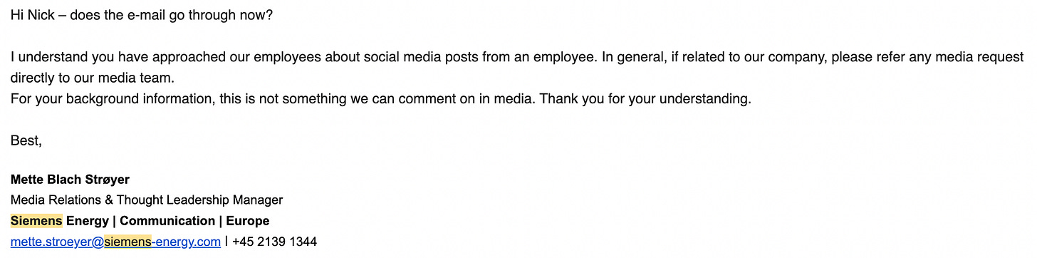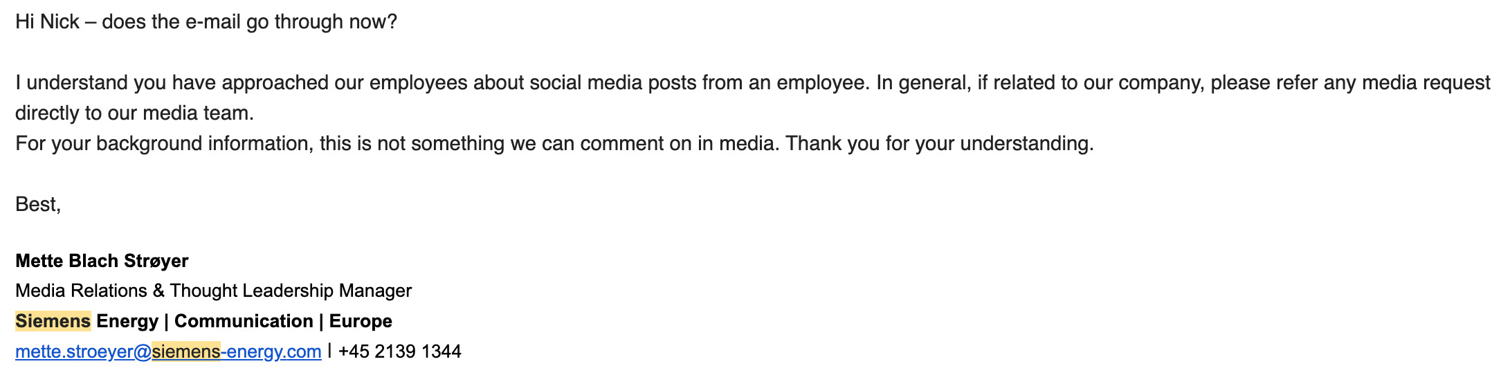 När Rickard Lundmarks närmsta chef, Joakim Sjögren på Siemens Energy i Trollhättan fick höra om Rickards Lundmarks uttalanden sa han först att det absolut inte är något som företaget står för enligt deras värdegrund och företagspolicy, och att både han och företaget tar starkt avstånd från det Rickard Lundmark skrivit. Han bad sedan om att få materialet skickat per mail. Sjögren sa också att de står för allas lika värde. Han bad mig därefter att återkomma per telefon dagen efter.