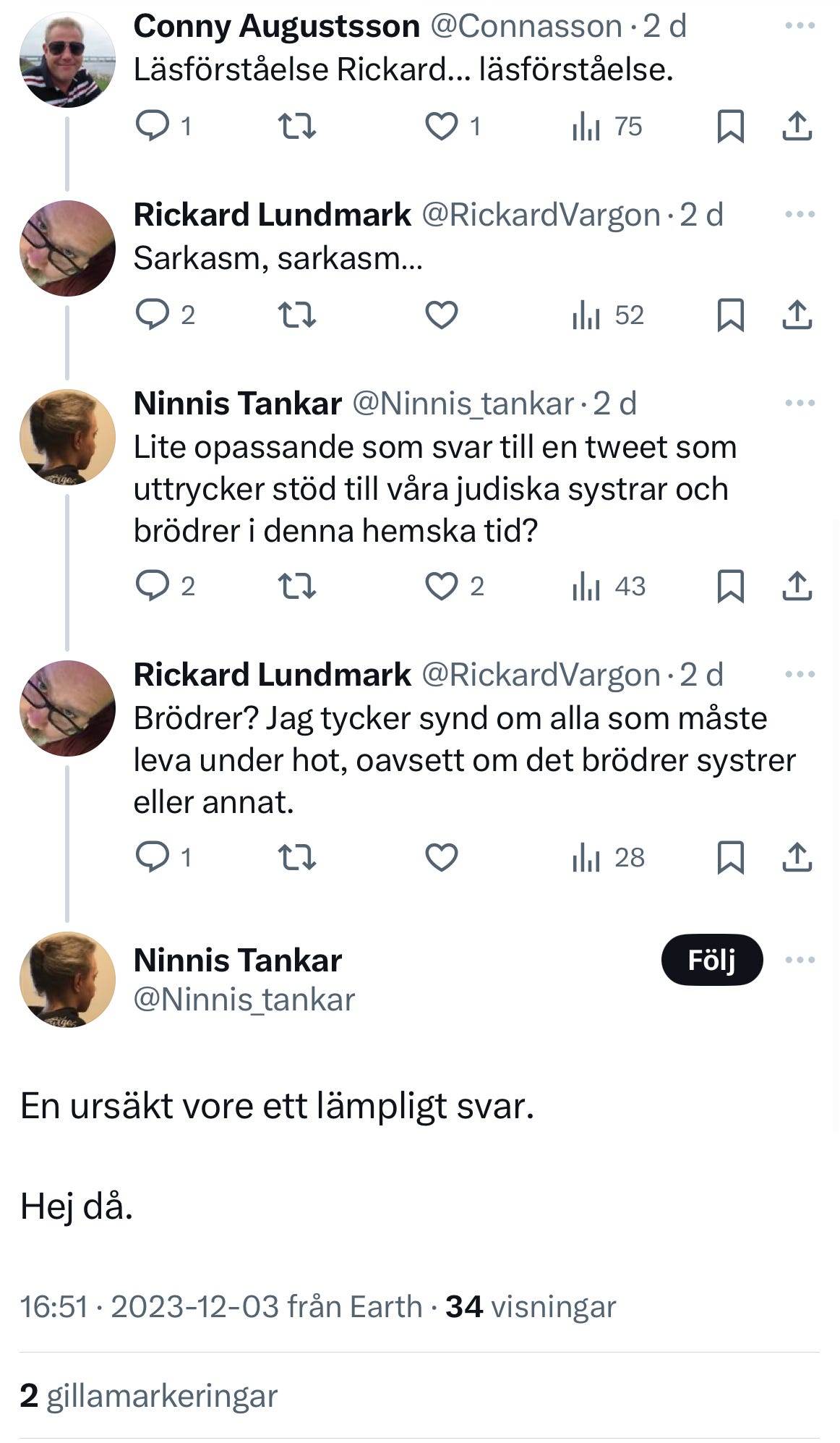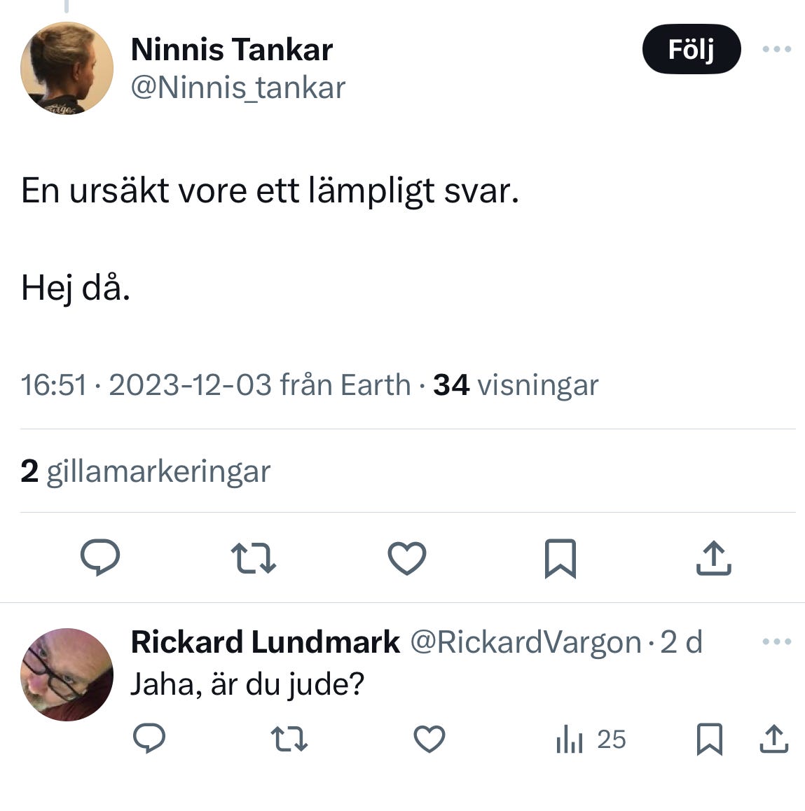 När en kvinna säger att en ursäkt vore ett lämpligt svar, svarar Rickard Lundmark “Jaha, är du jude?”
